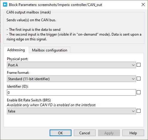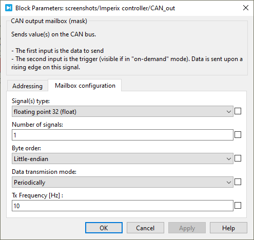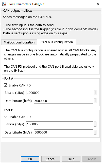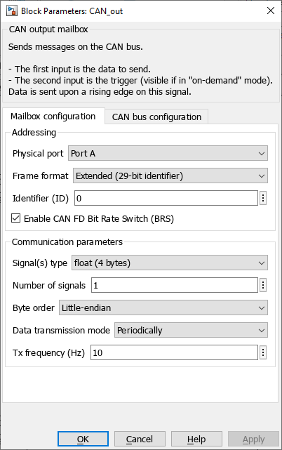 The CAN_out block implements an output mailbox that supports sending messages using the CAN bus protocol. To receive messages, the CAN in block should be used instead. The supported CAN protocol variants are as follows:
