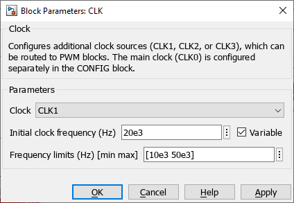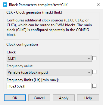 The CLK block is used to configured the optional CLK1, CLK2 and CLK3, which can be connected to PWM blocks. They support glitch-less reconfiguration during runtime as described in the variable frequency operation page.