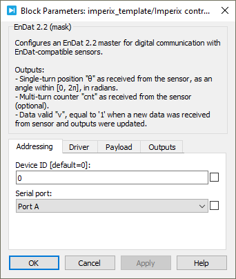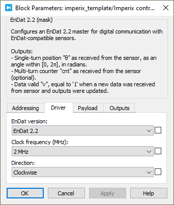 The EnDat block instantiates an EnDat master to communicate with compatible digital encoders and similar digital sensors, typically in motor drive applications.