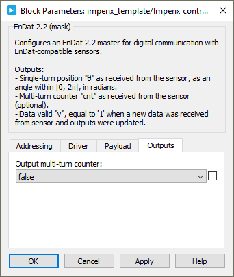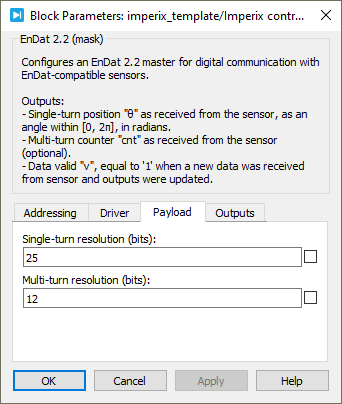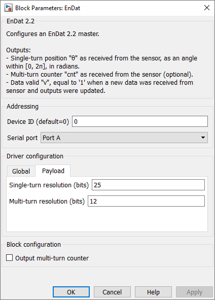 Device IDselects which device to address when used in a multi-device configuration.Serial portselects the serial port.EnDat versionspecifies the EnDat version of the sensor, either EnDat 2.2 or EnDat 2.1.Clock frequencyspecifies the transmission clock frequency for the BiSS-C communication, in MHz. The clock frequency cannot exceed 10 MHz, as defined by the BiSS-C standard.Directionspecifies the direction as clockwise or counterclockwise. When counterclockwise is selected, the output angle θ is 2π-θ’, where θ’ is the angle received from the sensor.Single-turn resolutionspecifies the resolution (i.e., number of bits) for the single-turn position. The single-turn resolution cannot exceed 32 bits.Multi-turn resolutionspecifies the resolution (i.e., number of bits) for the multi-turn counter. The multi-turn resolution cannot exceed 32 bits.Output multi-turn countershows or hides the multi-turn counter outputcnt.