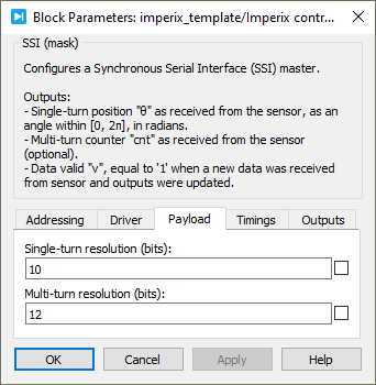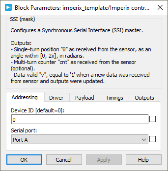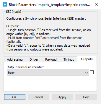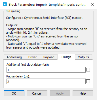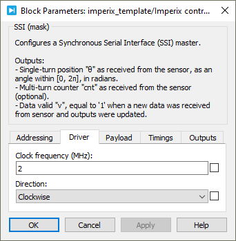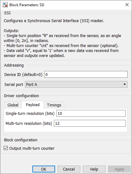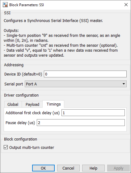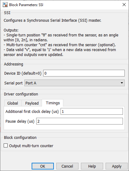 Device IDselects which device to address when used in a multi-device configuration.Serial portselects the serial port.Clock frequencyspecifies the transmission clock frequency for the SSI communication, in MHz. The clock frequency cannot exceed 2 MHz, as defined by the SSI standard.Directionspecifies the direction as clockwise or counterclockwise. When counterclockwise is selected, the output angle θ is 2π-θ’, where θ’ is the angle received from the sensor.Single-turn resolutionspecifies the resolution (i.e., number of bits) for the single-turn position. The single-turn resolution cannot exceed 32 bits.Multi-turn resolutionspecifies the resolution (i.e., number of bits) for the multi-turn counter. The multi-turn resolution cannot exceed 32 bits.Additional first clock delayspecifies the delay, in us, added to the first half clock period.Pause delayspecifies the duration, in us, of the recovery time after each transmission.Output multi-turn countershows or hides the multi-turn counter outputcnt.