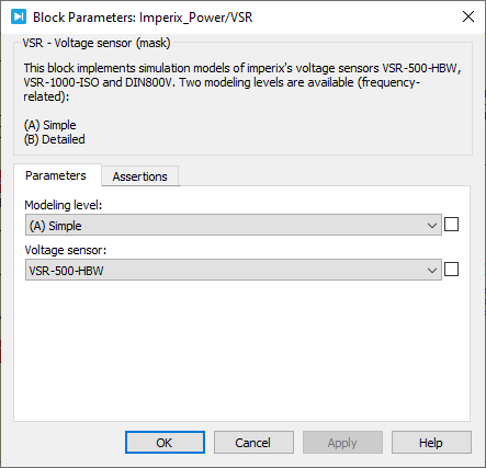 Modeling levelselects the modeling level of the voltage sensor.Voltage sensorselects the type of the voltage sensor.