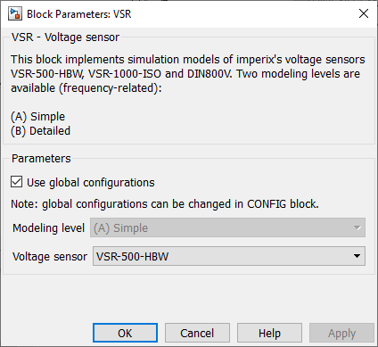 Use global configurationsis ticked when the block receives global configurations from theConfigblock.Modeling levelselects the modeling level of the voltage sensor.Voltage sensorselects the type of the voltage sensor.