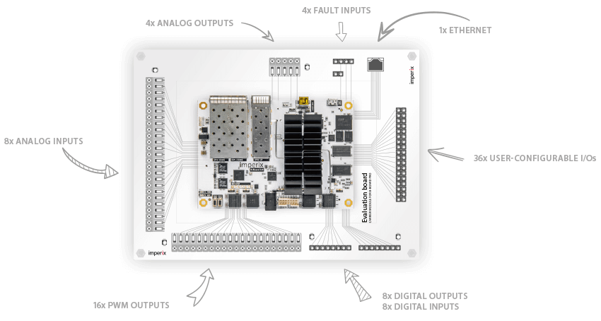 PWM outputs | 16x Electrical (1.8V) 16x Electrical (3.3V) | Communication | 1x USB 2.0 (computer) 1x Ethernet 1Gbps (RJ45) 3x SFP+ 5Gbps 1x CAN + user high-speed I/Os |