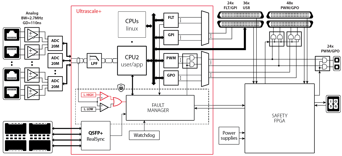 FPGA | Kintex US+ 504K | Fault inputs | 24x Electrical (3.3V/5.0V) 24x Analog comparators 1x Electrical interlock |