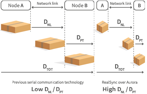With older communication technologies and data processing devices, DNL used to be lower than DPT. In other words, most of the delays were located inside the devices and not the links between them. Nowadays, this paradigm has changed. Typically, FPGA devices have progressed much faster than communication links, which somewhat suffer also from physical limitations. For instance, as shown in the table below, when comparing RealSync with PESnet, DNL was reduced by a factor of 3, while DPT was reduced by a factor of 47!