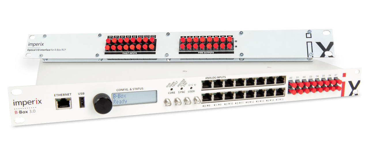 Combined with the optical expansion board, one B-Box RCP 3.0 has a total of 32 optical PWM outputs and 16 optical FLT inputs which means it can control up to 8 NPC control legs, 8 full-bridge modules, or 16 half-bridge modules.